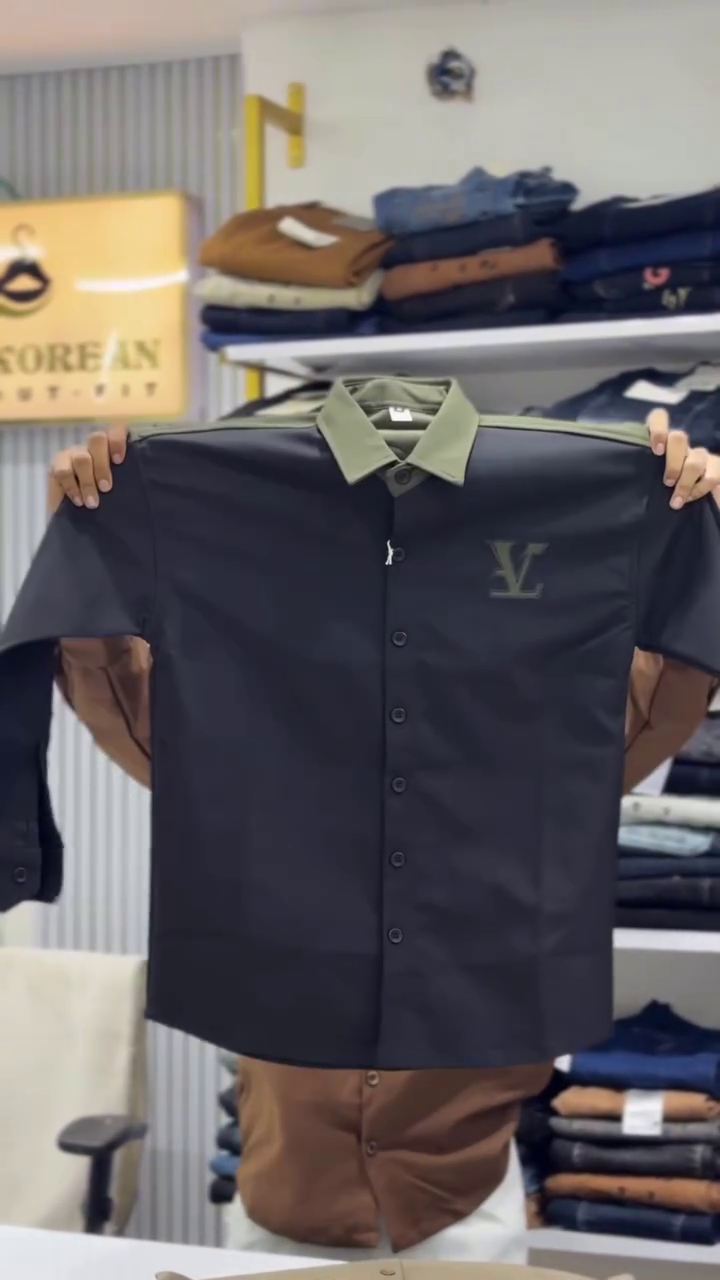 Make a striking style statement with this black short-sleeved shirt featuring a green collar and a prominent “V” logo on the chest pocket. Designed for fashion-forward individuals, this shirt combines casual comfort with standout design elements, making it perfect for everyday wear, urban streetwear, or smart-casual occasions.