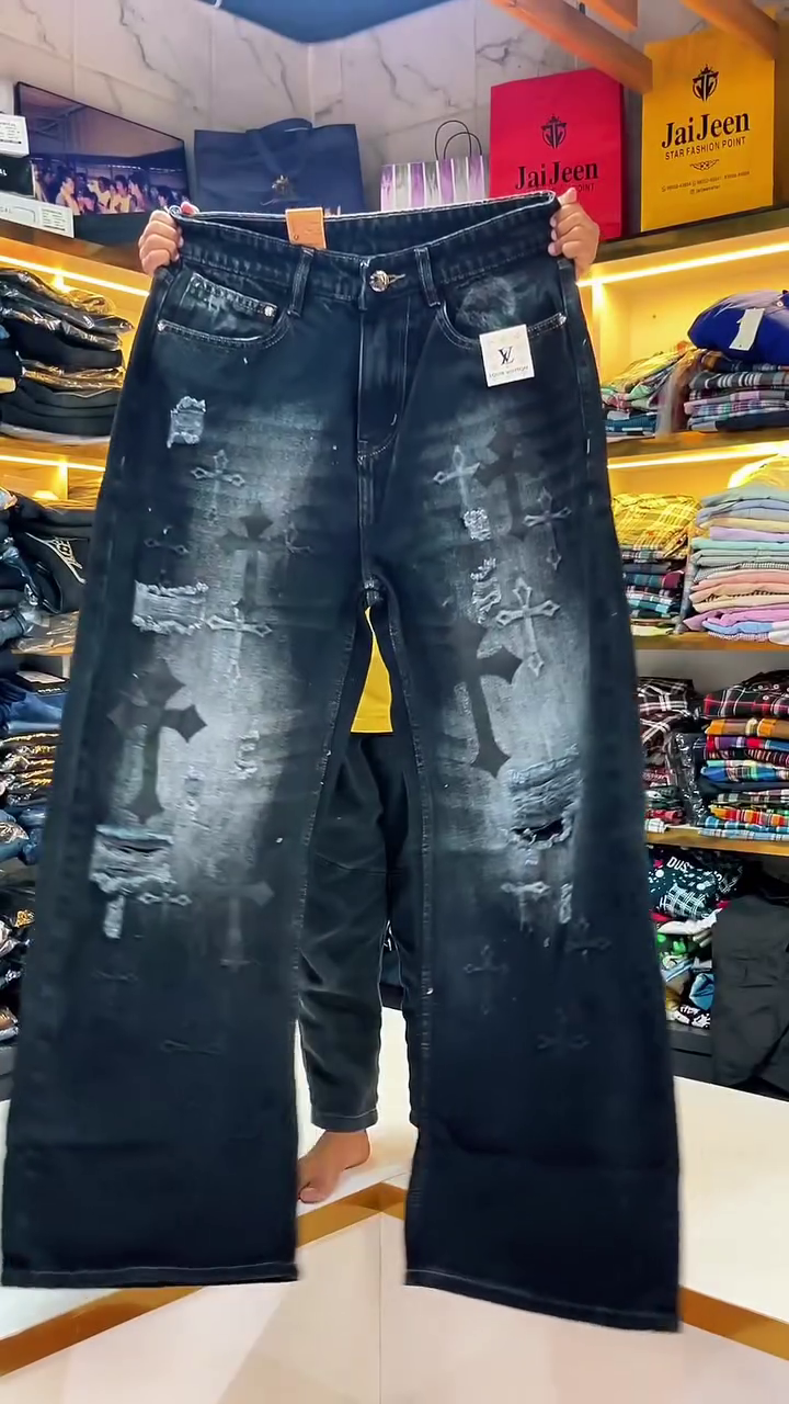 What truly sets these jeans apart is the prominent cross motif—a graphic detail that appears subtly yet powerfully, enhancing the jeans’ unique personality. This emblematic design injects an element of symbolic style, perfect for those who want their clothing to reflect individuality and a touch of boldness.
