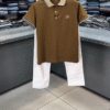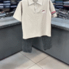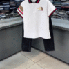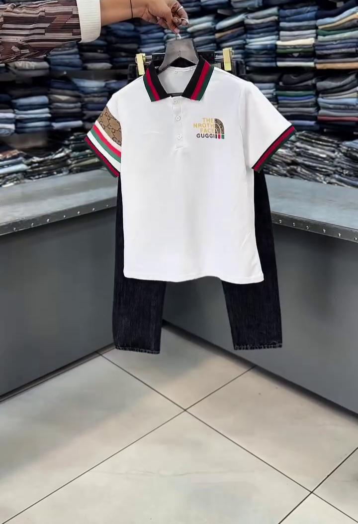 The white polo shirt is crafted from soft, breathable fabric, providing comfort while maintaining a polished look. Its standout feature—the green and red striped detailing on the collar and sleeves—adds a pop of color and a sporty edge to the otherwise classic silhouette. A subtle logo graphic on the chest enhances the shirt’s aesthetic, giving it a distinctive personality without overpowering the design. The polo’s structured collar and short sleeves create a versatile piece that can be dressed up or down with ease.