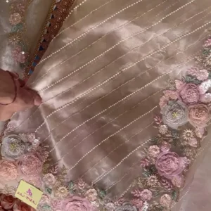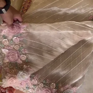 The intricate embroidery along the borders is the highlight of this ensemble. It features exquisitely detailed floral motifs in shades of blush pink, ivory, and pastel green, adorned with shimmering sequins and beads. Each flower is meticulously designed to exude realism, giving the saree a touch of ethereal beauty. The inclusion of pearls in a linear pattern enhances the saree’s elegance, offering a contemporary twist to its traditional appeal.