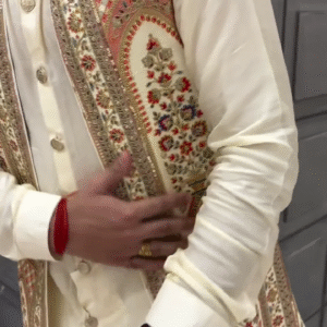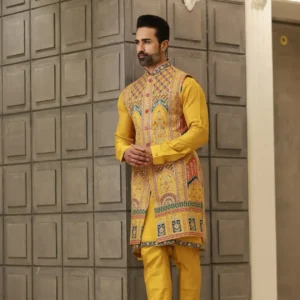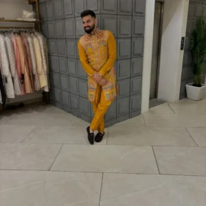 Crafted from premium quality fabric, the kurta offers a comfortable yet regal fit that drapes effortlessly, ensuring ease of movement without compromising elegance. The highlight of this ensemble is its intricate embroidery—vibrant, detailed, and thoughtfully placed to enhance the overall charm. The embroidery adds a royal touch, making it perfect for grand occasions such as weddings, receptions, cultural celebrations, or festive gatherings.