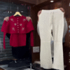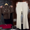 This outfit can be styled with heeled boots, pointed-toe flats, or classic pumps, depending on the occasion. Minimalist accessories such as delicate jewelry or a structured handbag will further enhance the elegant yet modern appeal. The ensemble seamlessly merges timeless elegance with contemporary detailing, making it a versatile and standout choice for any wardrobe.