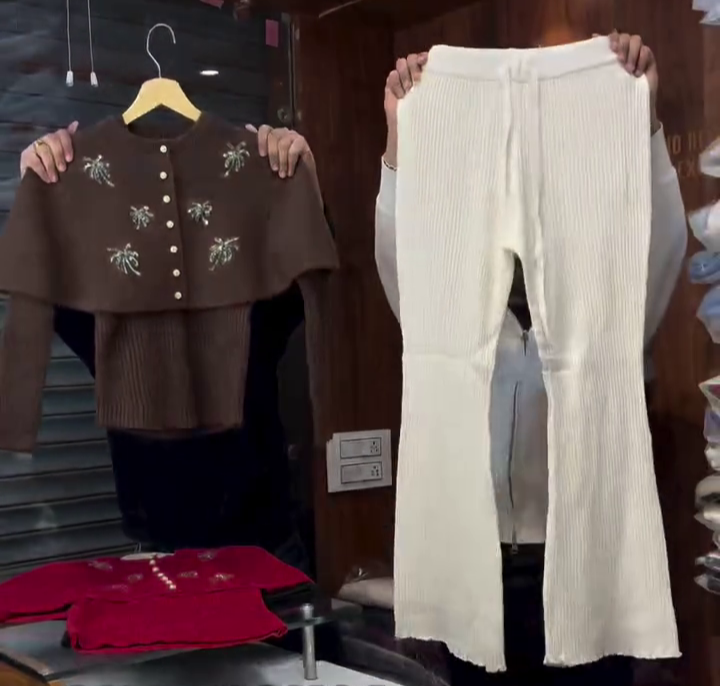 Elevate your wardrobe with a refined blend of sophistication and contemporary style through this white ribbed cardigan with an attached embroidered capelet, paired with black flared trousers. This ensemble strikes the perfect balance between elegance and modern fashion, making it ideal for workwear, smart-casual occasions, or stylish day-to-night transitions.