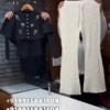 Complementing the top are black flared trousers, designed to elongate the silhouette and provide a sophisticated base for the outfit. The tailored flare adds movement and elegance, while the sleek black hue creates a striking contrast against the crisp white cardigan. Together, this combination exudes a refined, fashion-forward aesthetic suitable for various occasions.