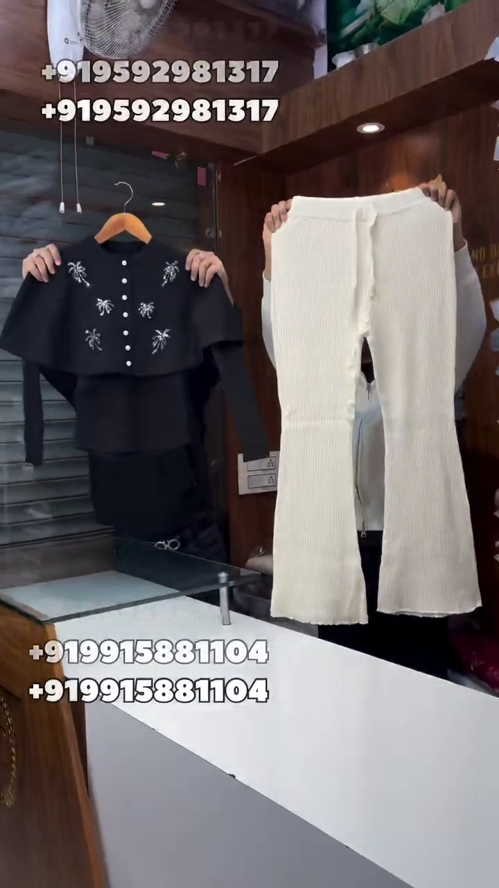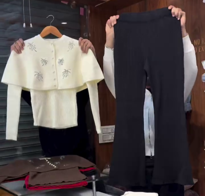Elegant & Modern – White Ribbed Cardigan with Capelet and Black Flared Trousers
