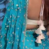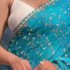 The sari is paired with a simple yet sophisticated white sleeveless blouse (choli), which provides a striking contrast to the rich turquoise fabric. The blouse’s clean lines and minimalist design allow the ornate sari to take center stage while maintaining a balanced overall look. A delicate gold chain with a small pendant adorns the wearer’s neck, adding a subtle touch of glamour without overwhelming the ensemble.