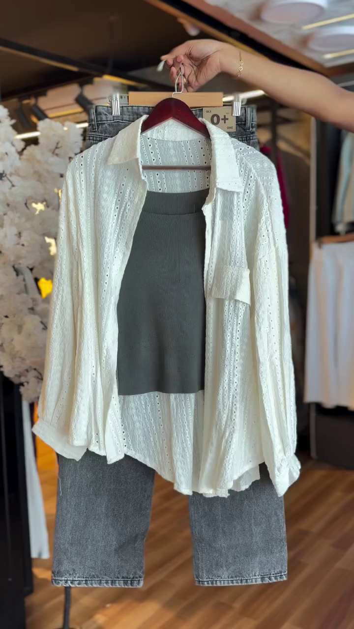 The white shirt features a long-sleeved, button-up design with delicate eyelet embroidery, giving it a sophisticated yet soft, feminine touch. The texture adds depth and charm, making it perfect for both casual and semi-formal occasions.