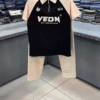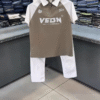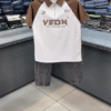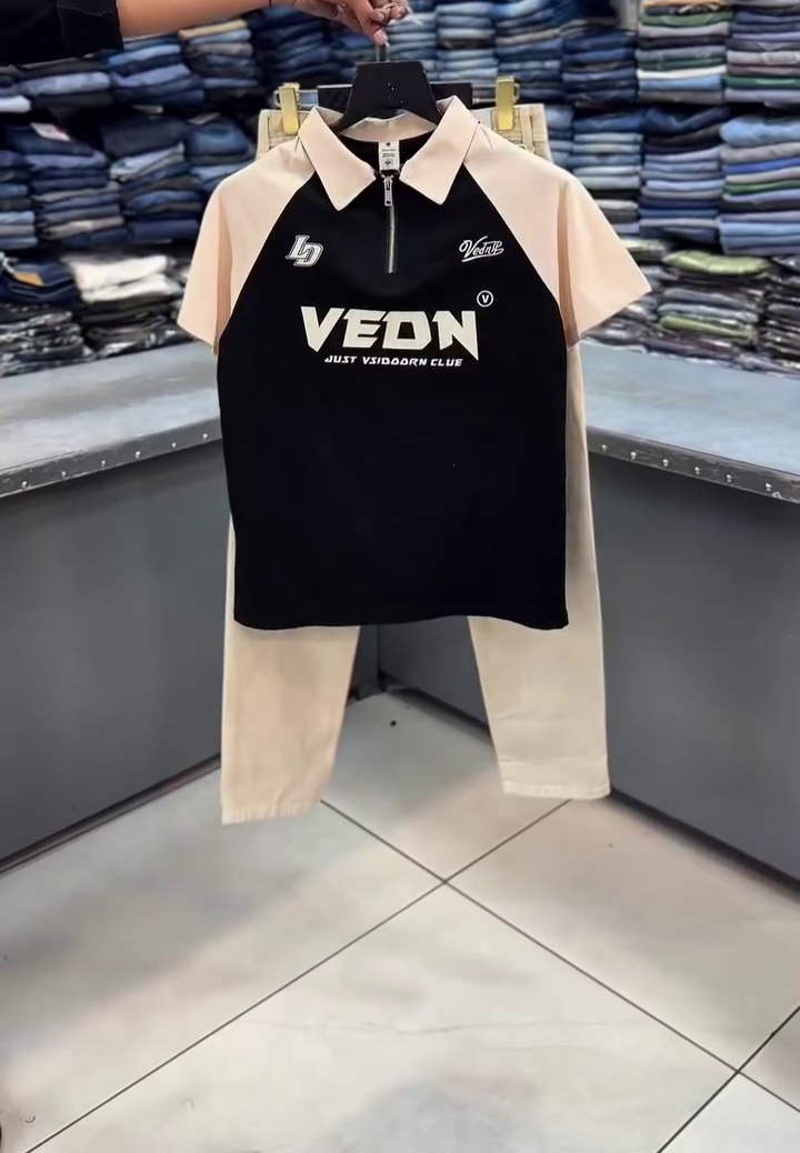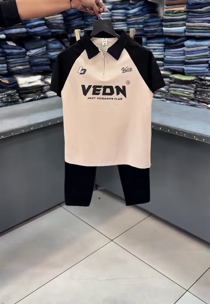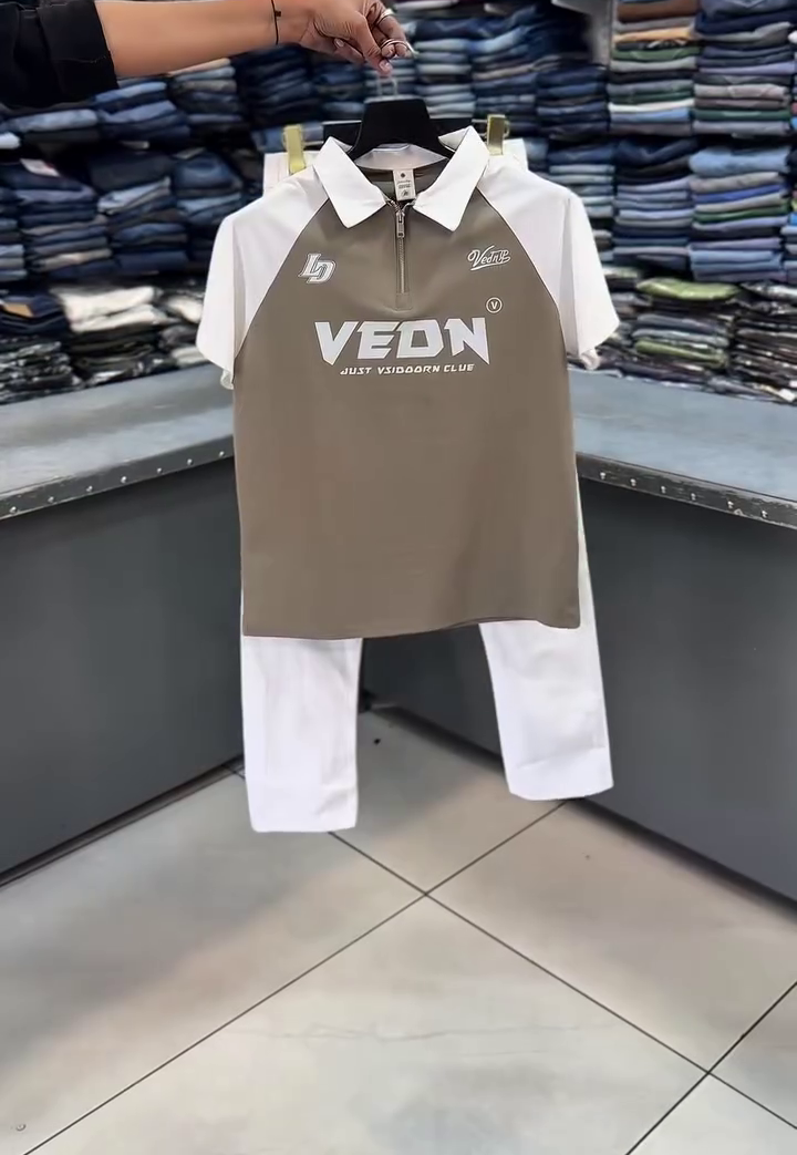 The VEDN Club half-zip polo shirt features a crisp white base contrasted with rich brown sleeves and collar, offering a bold and modern color-blocked aesthetic. The graphic print adds a unique, fashion-forward touch, while the half-zip design allows for versatile styling—zip it up for a clean, structured look or leave it slightly open for a relaxed vibe. Crafted from soft, breathable fabric, the polo ensures comfort and mobility throughout the day.