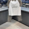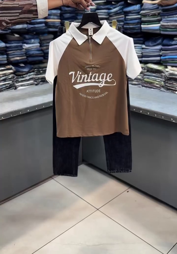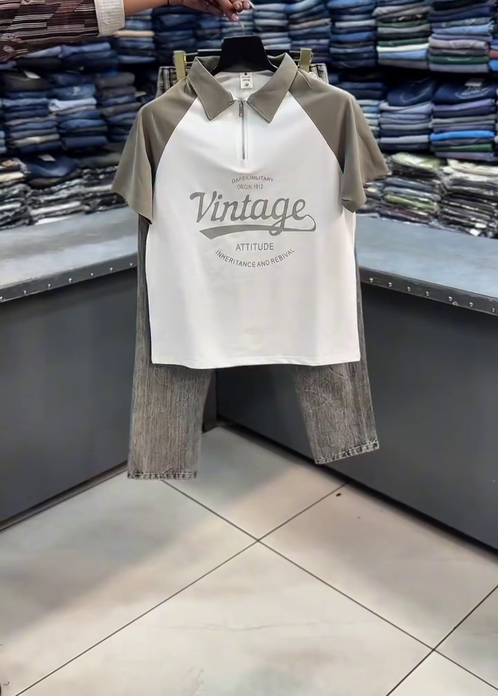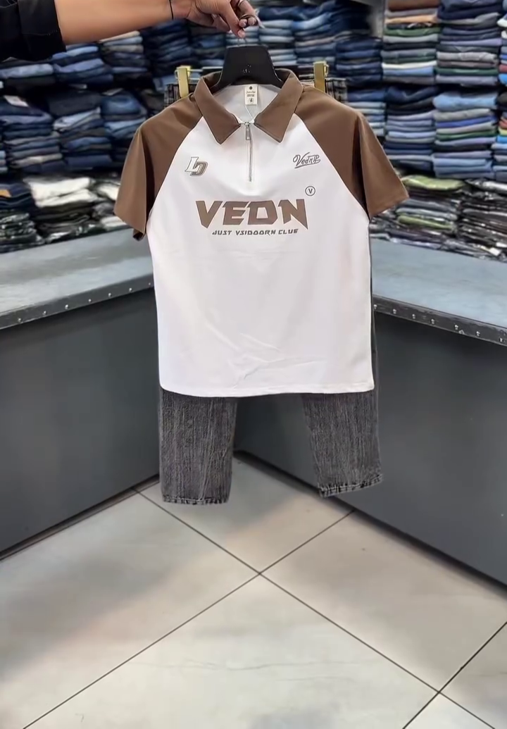 Step into contemporary casual fashion with the VEDN Club graphic print half-zip polo shirt in white with brown sleeves and collar, paired with grey high-rise denim jeans. This combination perfectly blends streetwear-inspired detailing with timeless denim aesthetics, making it ideal for casual outings, city strolls, or urban street-style looks.