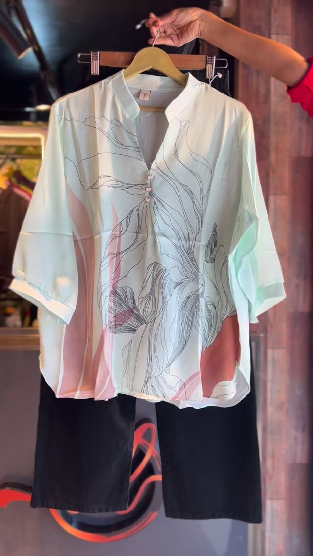 Make a chic statement with this pastel mint tunic featuring abstract floral line art print in subtle hues of peach and grey. The V-neckline with buttoned detailing adds a modern touch, while the relaxed fit ensures all-day comfort. Paired with solid black wide-leg pants, this co-ord set offers a perfect blend of elegance and casual style. Ideal for office wear, travel, or casual outings, it’s a must-have for effortless dressing.