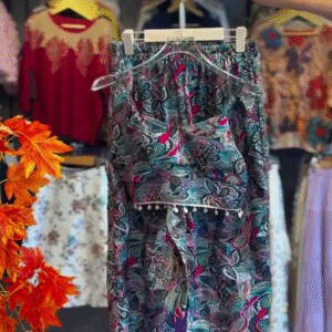 Is co-ord set ka printed shoulder-strap top gives a sleek, modern vibe, jabki matching shrug aur straight-fit trousers add karte hain effortless sophistication.