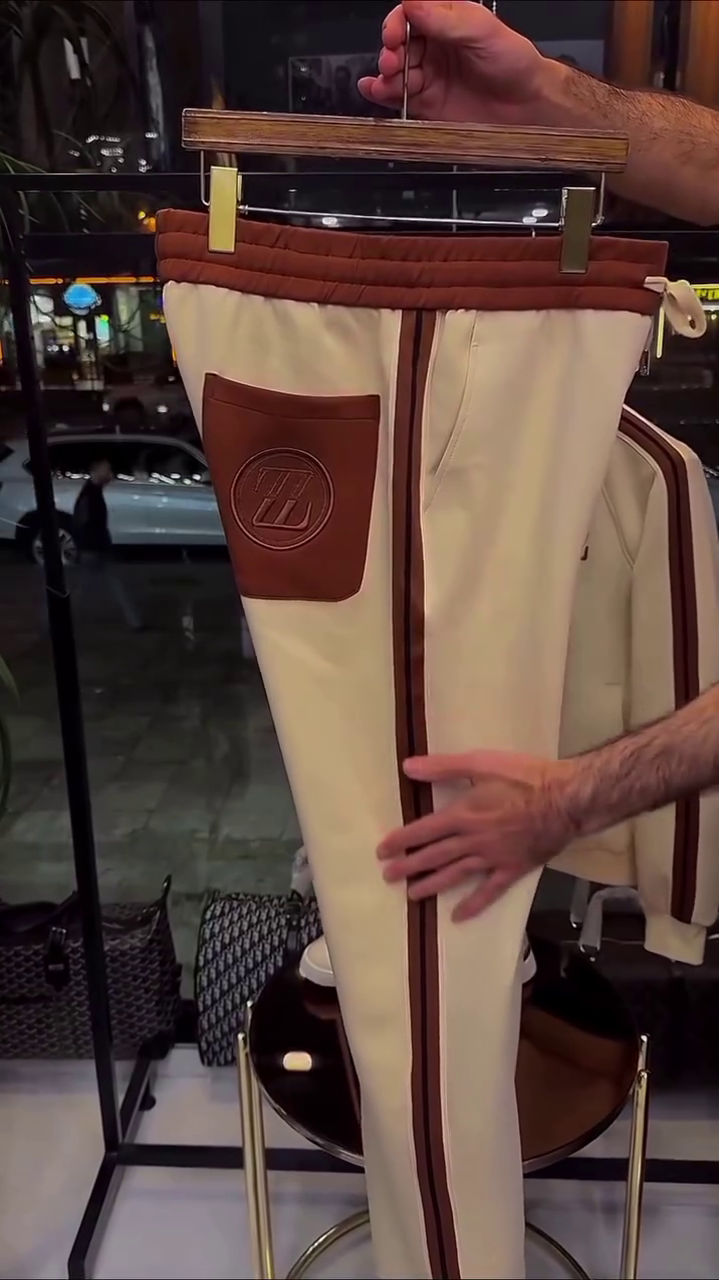 The matching tracksuit bottoms feature the same cream and brown palette, offering a relaxed yet refined fit. An elastic waistband with drawstring guarantees all-day comfort, while tailored leg lines maintain a polished, luxury appearance. Together, the top and bottoms create a harmonious, cohesive outfit that merges sporty comfort with refined elegance.