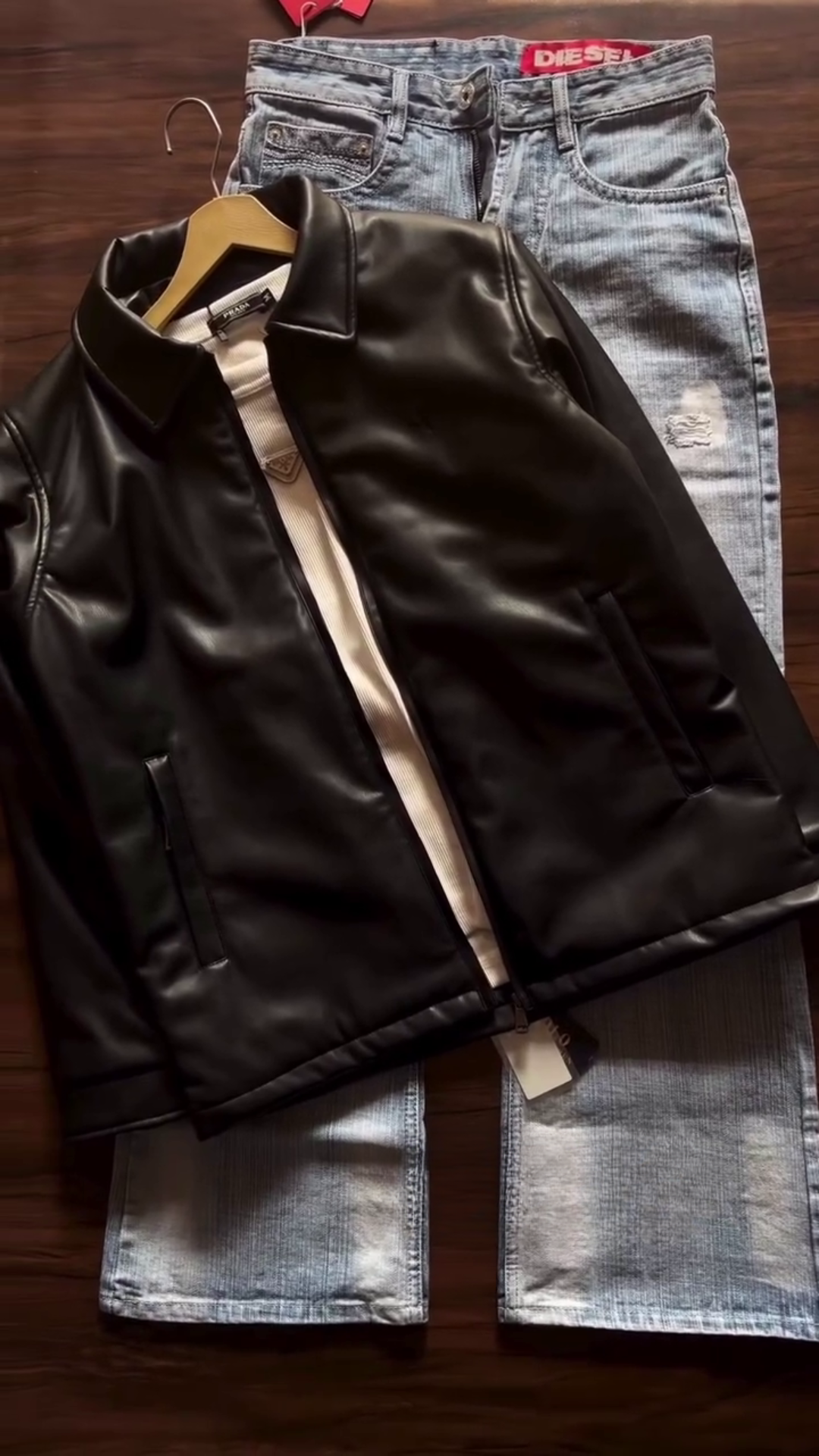 The black faux leather collared jacket paired with light wash denim jeans featuring a Diesel logo delivers a bold, modern look rooted in street-ready confidence. This outfit blends edgy outerwear with casual denim, creating a versatile style that works effortlessly for day-to-night wear.