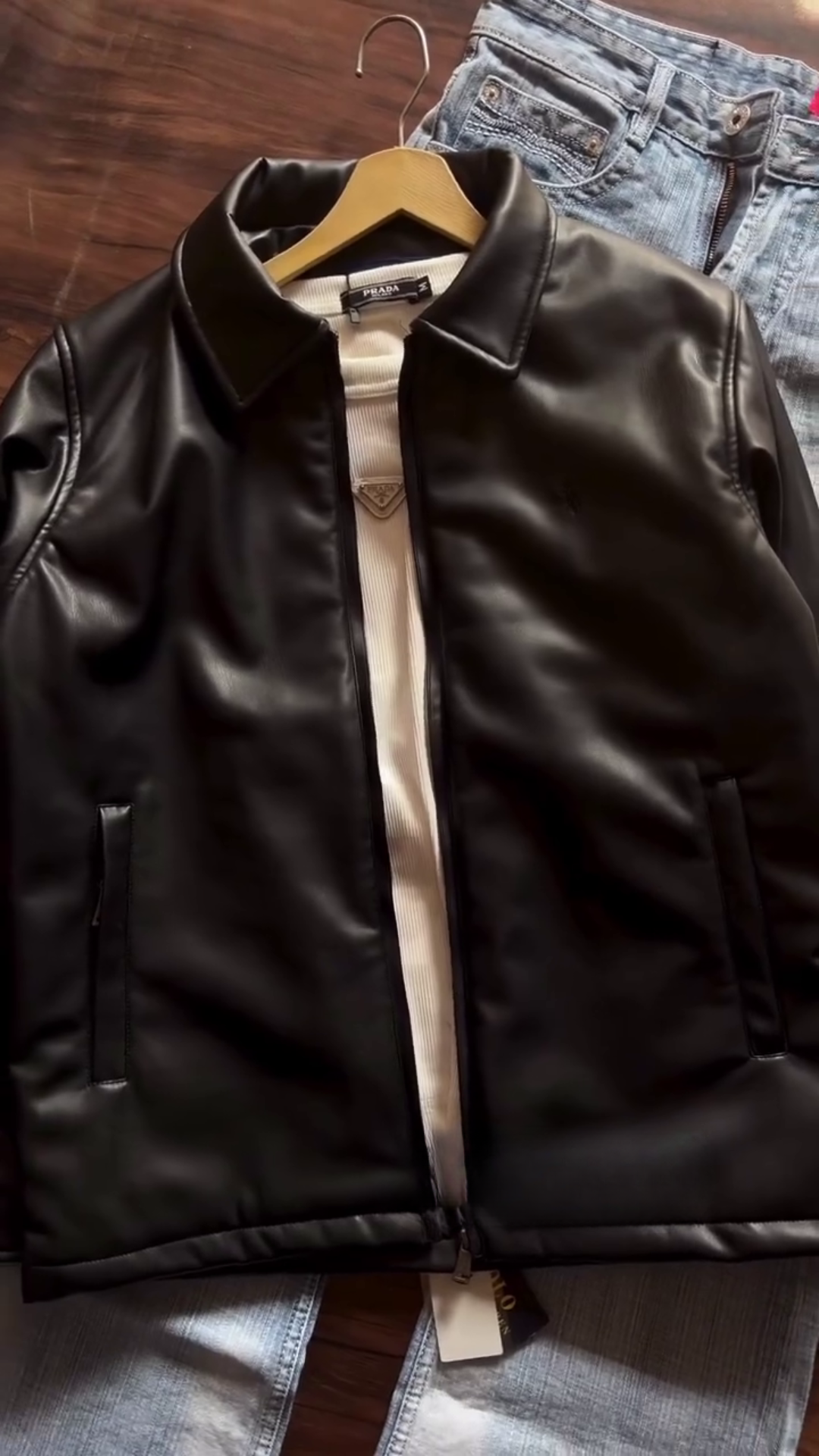 The black faux leather jacket is the statement piece of the ensemble. Designed with a structured collar, it adds a classic silhouette while maintaining a contemporary edge. The smooth faux leather finish gives the jacket a sleek, polished appearance, making it a cruelty-free alternative to traditional leather without sacrificing style. Its tailored structure enhances the upper body, offering a confident, streamlined fit that elevates any casual outfit.